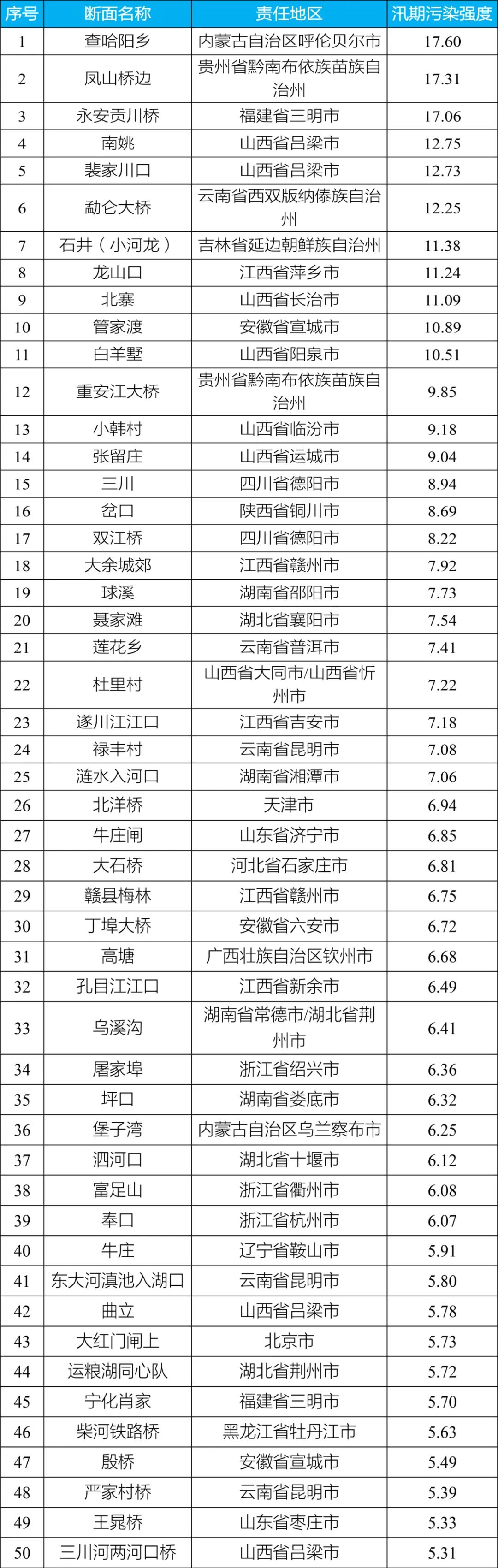 全國汛期污染強(qiáng)度較大的前50名斷面分布在20個省份(見附件3),數(shù)量較多省份為山西(9個)、江西(5個)、云南(5個)。其中,內(nèi)蒙古自治區(qū)呼倫貝爾市查哈陽鄉(xiāng)斷面、貴州省黔南布依族苗族自治州鳳山橋邊斷面、福建省三明市永安貢川橋斷面汛期污染強(qiáng)度位于全國前三名,分別達(dá)到考核目標(biāo)限值的17.6倍、17.3倍、17.1倍。