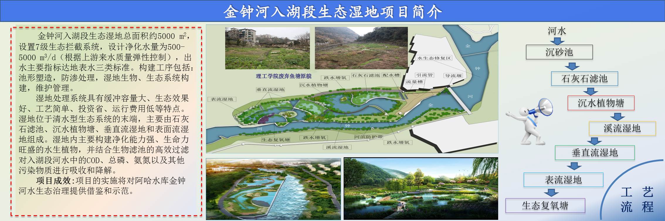 金鐘河入湖段生態(tài)濕地是中科水治理在生態(tài)濕地領(lǐng)域的一大突破,濕地主要由石灰石濾池、沉水植物塘、垂直流濕地和表面流濕地組成,設(shè)計(jì)凈化水量為500-5000m3/d,根據(jù)上游來水質(zhì)量,通過引流裝置彈性控制入水量。設(shè)置的7級生態(tài)攔截系統(tǒng),凈化水質(zhì),確保出水主要指標(biāo)達(dá)地表水環(huán)境質(zhì)量標(biāo)準(zhǔn)(GB3838-2002)Ⅲ類水標(biāo)準(zhǔn)。