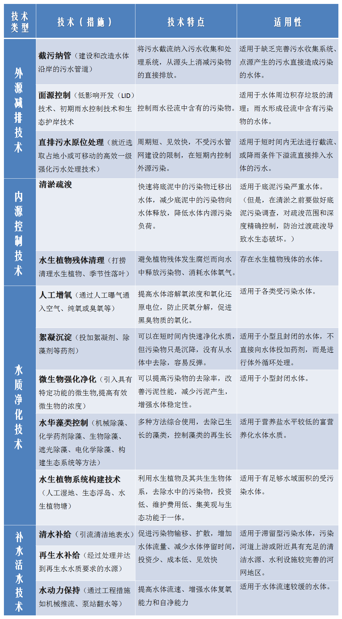 根據(jù)污染程度與治理目標(biāo)的不同,黑臭水體治理可分為應(yīng)急治理、水質(zhì)改善和長效保持三個階段。不同的階段,治理目標(biāo)不同,技術(shù)實施要點也不同。